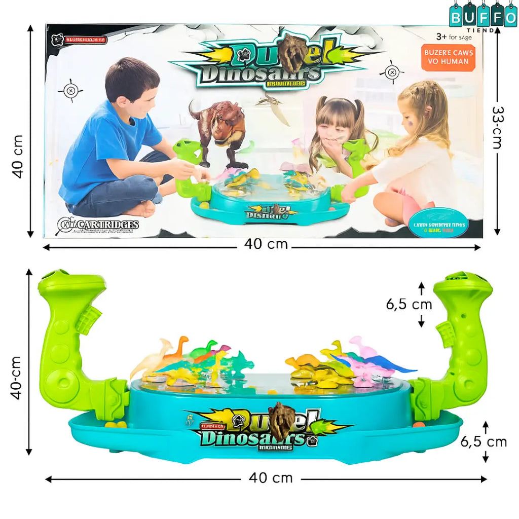 📦 Contenido del paquete: 1 tablero, 2 lanzadores de mango, 24 balas, 16 figuras de dinosaurios