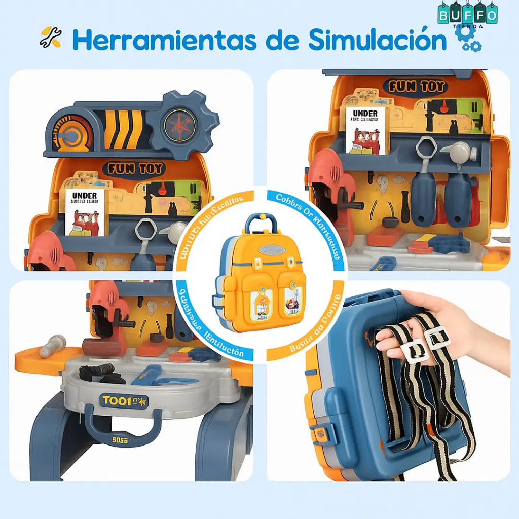 • Contenido: 1 base transformable (mochila/mesa) + Set de herramientas de juguete (destornillador, martillo, llaves, tornillos, etc.) + 1 Manual de armado