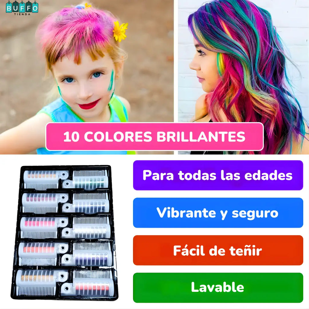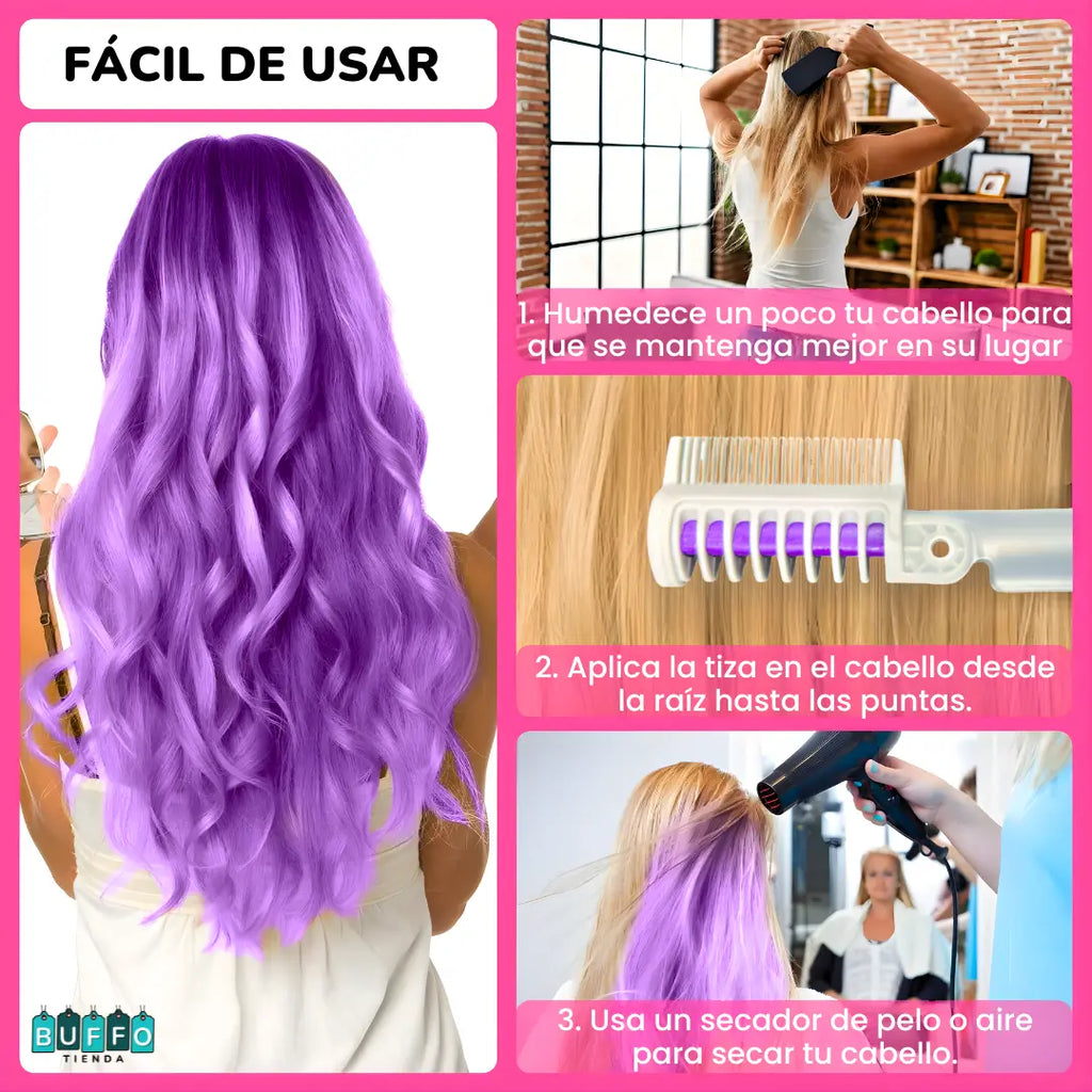 Nuestros peines de tizas están diseñados para lucir hasta 10 colores espectaculares en todo tipo de cabello, no uses tintes o químicos agresivos que dañan tu cabello.