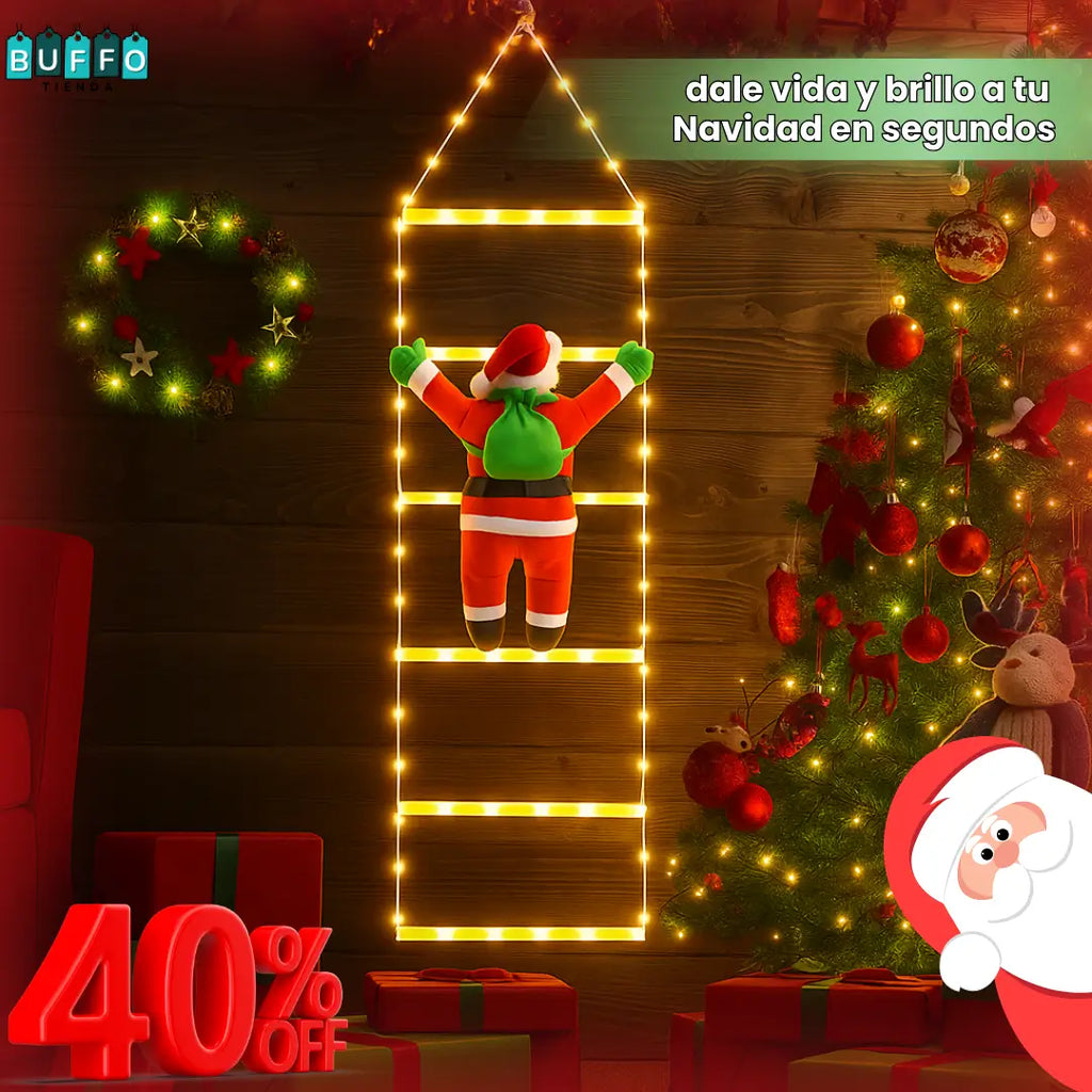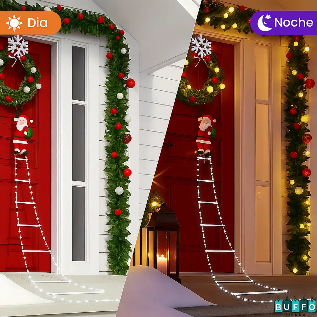 El Santa Escalador es una escalera decorativa con un alegre Papá Noel que parece subir hacia tu balcón, ventana o pared.